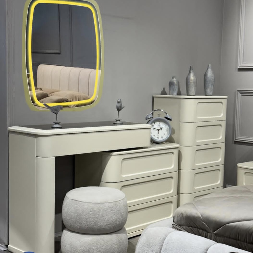 سرویس خواب سورن شامل تخت ۲۰۰ × ۱۶۰ و میز آرایش و آینه و صندلی و دو عدد پاتختی و فایل دراور می باشد